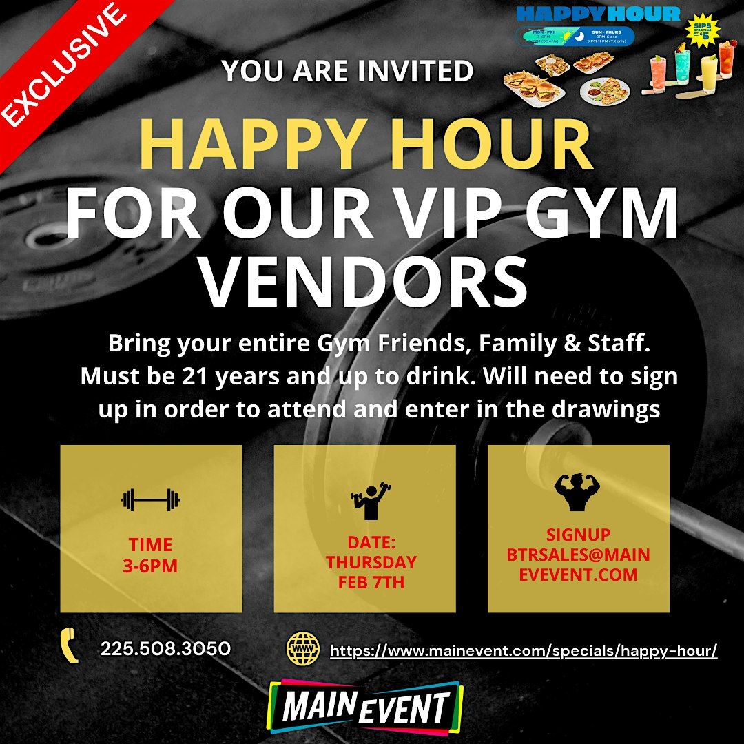 Vendor Happy Hour at Main Event Join us for a special Vendor Happy Hour at Main Event, exclusively for vendors who have partnered with u