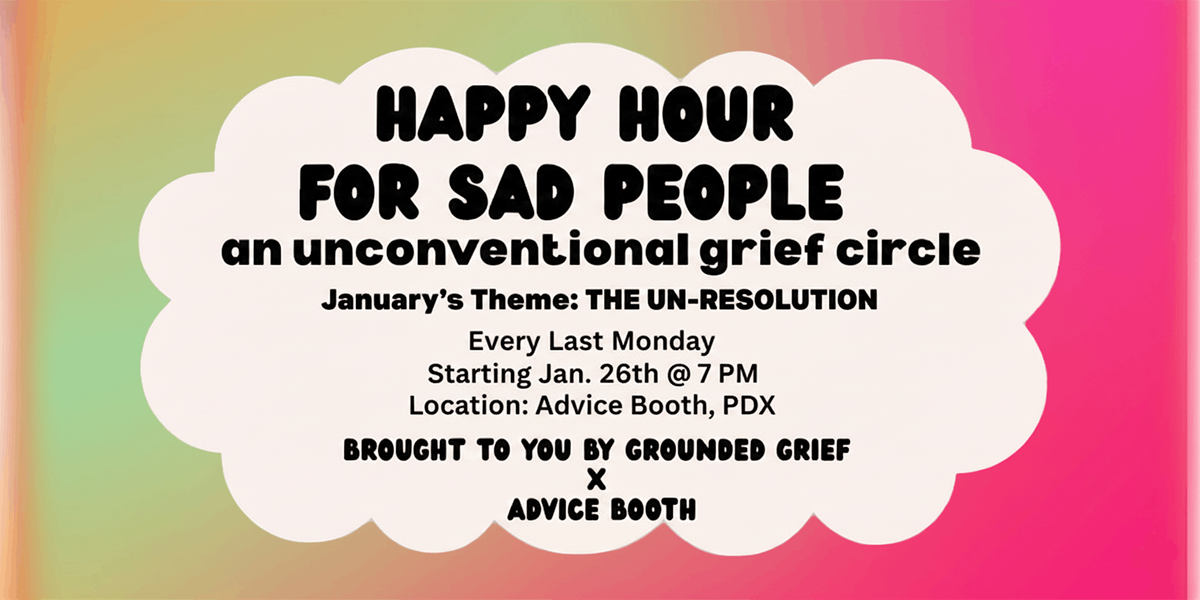 Starting this January, Grounded Grief x Advice Booth are turning "Happy Hour for Sad People" into a monthly residency. Every last Monday of the month, we're taking over the bar to prove that just because we're sad doesn't mean we don't want to be invited to the party. We want a space where grief can float in and out—where tears are welcome amidst laughter, and where your heaviest emotions can sit right next to your favorite cocktail (or mocktail).