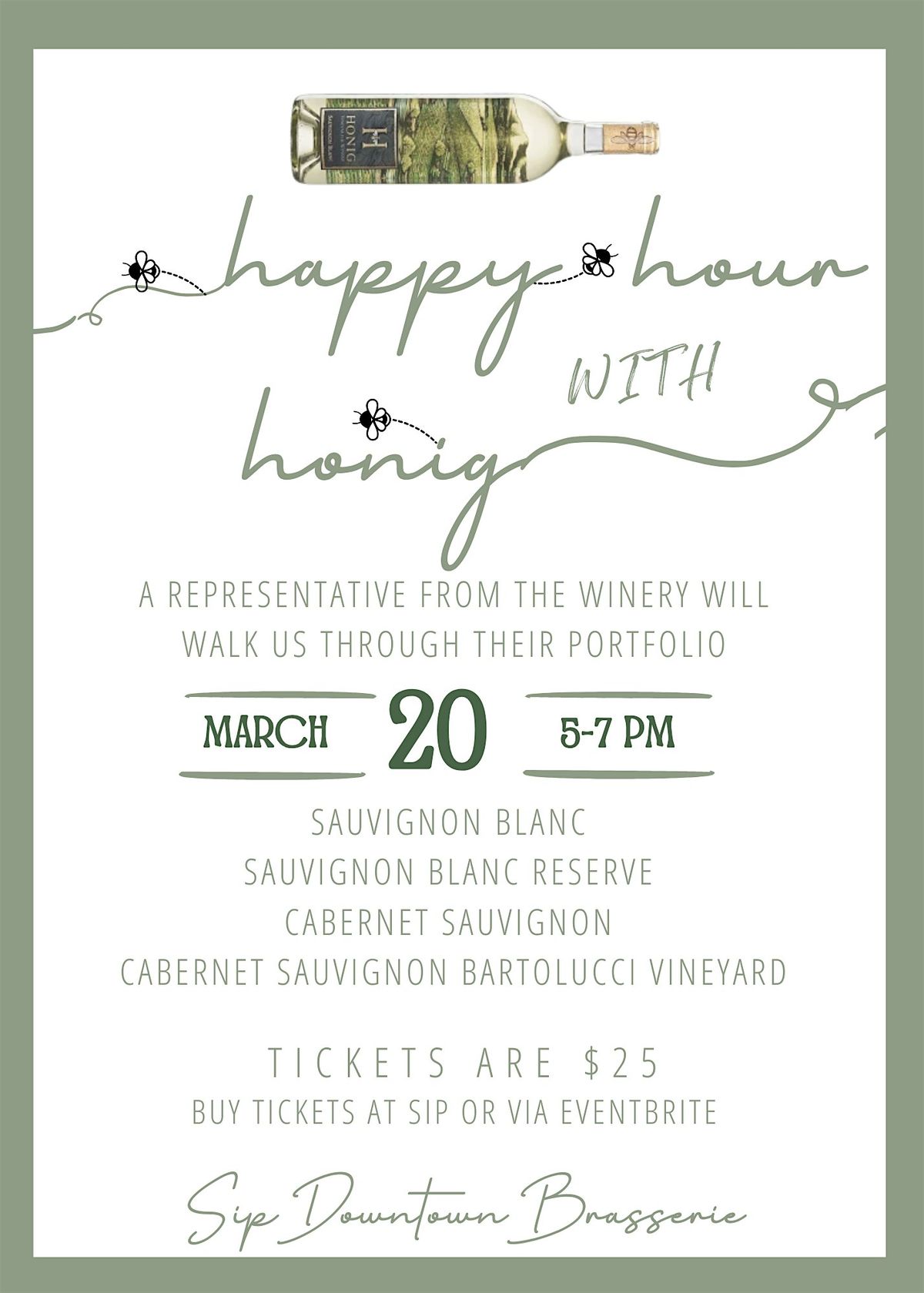 Kick off your Friday the right way with a special Happy Hour tasting at Sip Downtown Brasserie featuring wines from Honig Vineyard & Winery. A representative from the winery will guide us through a relaxed tasting of four of their standout wines, including Sauvignon Blanc, Sauvignon Blanc Reserve, Cabernet Sauvignon, and the Bartolucci Vineyard Cabernet Sauvignon. It’s the perfect way to wind down the week—great wine, great company, and a chance to learn a little more about one of Napa Valley’s most respected producers.