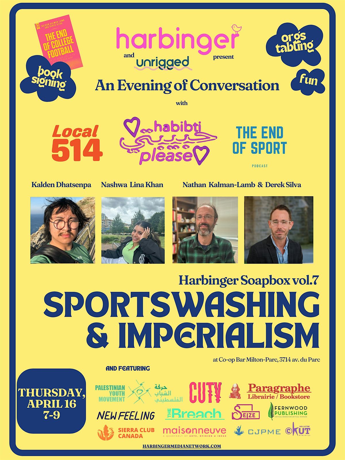 Don't miss HARBINGER SOAPBOX vol. 7: Sportswashing & Imperialism, a live podcast recording, book release and public speaking event at Bar Milton-Parc Co-op in Montreal on April 16th with The End of Sport hosts Dr. Nathan Kalman-Lamb (University of Fredericton) and Dr. Derek Silva (Western University), Habibti Please host and DAWN Canada organizer Nashwa Lina Khan and Local 514 and CUTV's Kalden Dhatsenpa and produced in collabroation with unrigged.ca and the Harbinger Media Network podcast community.