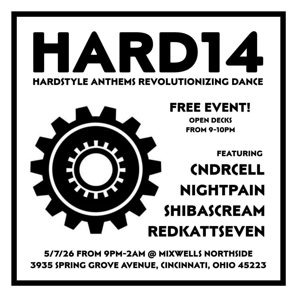 Mixwells Northside, Second Circle and Subsonic Frequencies presents H.A.R.D.: Hardstyle Anthems Revolutionizing Dance, a monthly hardstyle, hard house and dark techno themed event on the first Thursday of each month, with a focus on those pounding 140-160 BPM techno bangers that get your blood pumping!