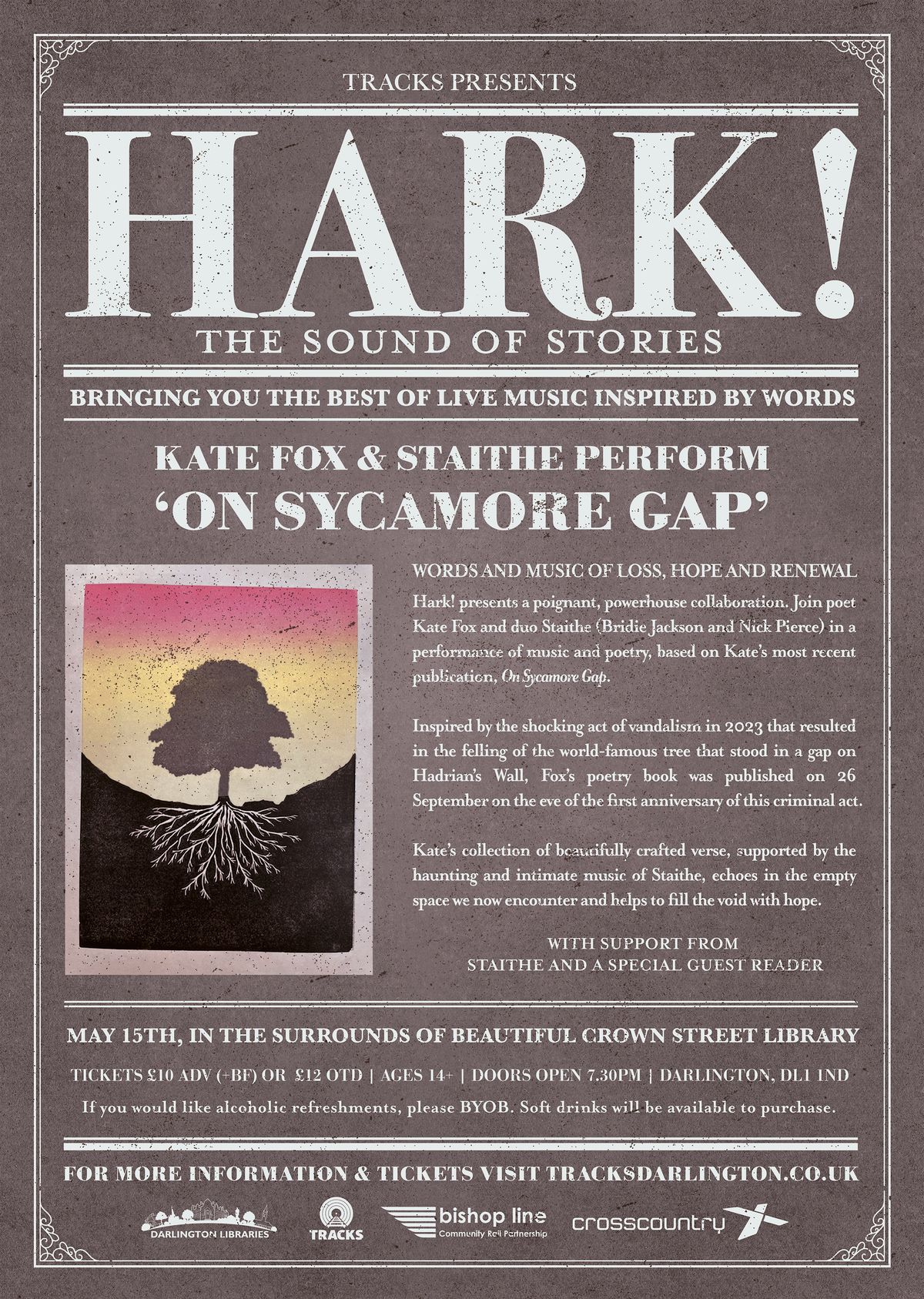 Join poet Kate Fox and duo Staithe (Bridie Jackson and Nick Pierce) in a performance of music and poetry, based on Kate’s most recent publication, On Sycamore Gap.