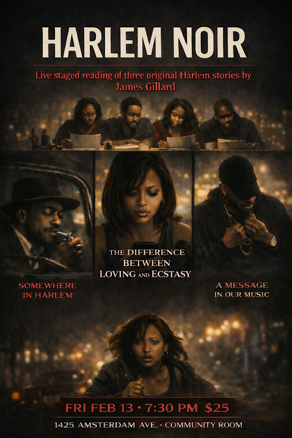 HARlEM NOIR Experience the passion, struggle ambition and danger of the Harlem experience in 3 original works by James Gillard. This filmmaker playwright author has captured the soul of Harlem with his plays, books and films.