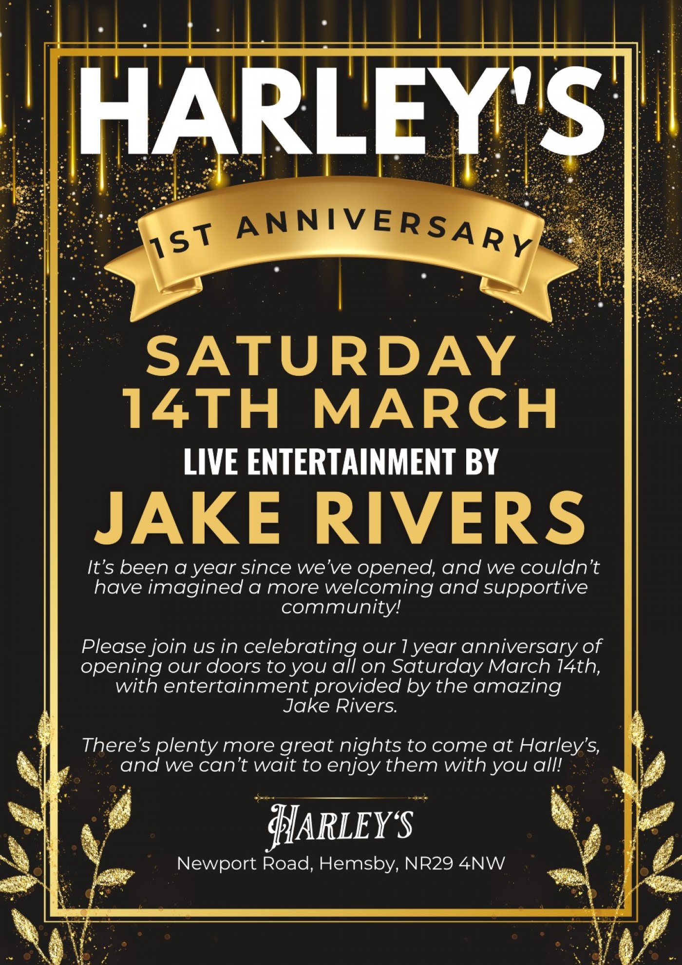 Harley's 1st Anniversary on Saturday 14th March 2026 - Staring Jake Rivers as ELVIS from 8:30PM.