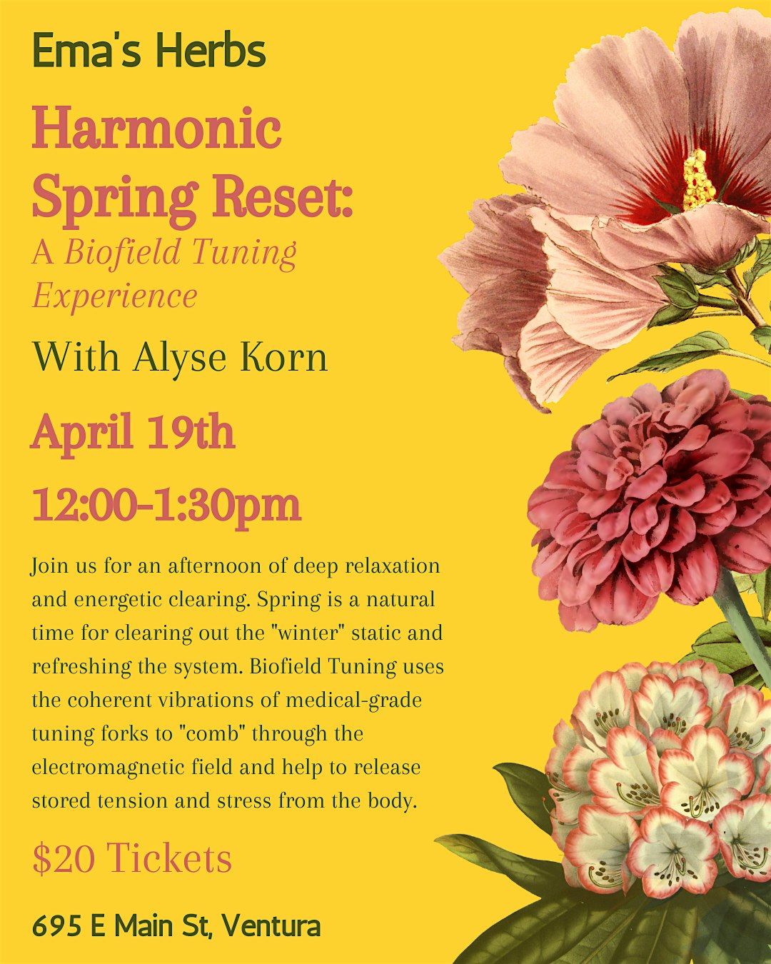 Join Advanced Certified Biofield Tuning Practitioner Alyse for an afternoon of deep relaxation and energetic clearing. Spring is a natural time for clearing out the "winter" static and refreshing the system. Biofield Tuning uses the coherent vibrations of medical-grade tuning forks to "comb" through the electromagnetic field (the biofield) that surrounds the human body, helping to release stored tension and stress.