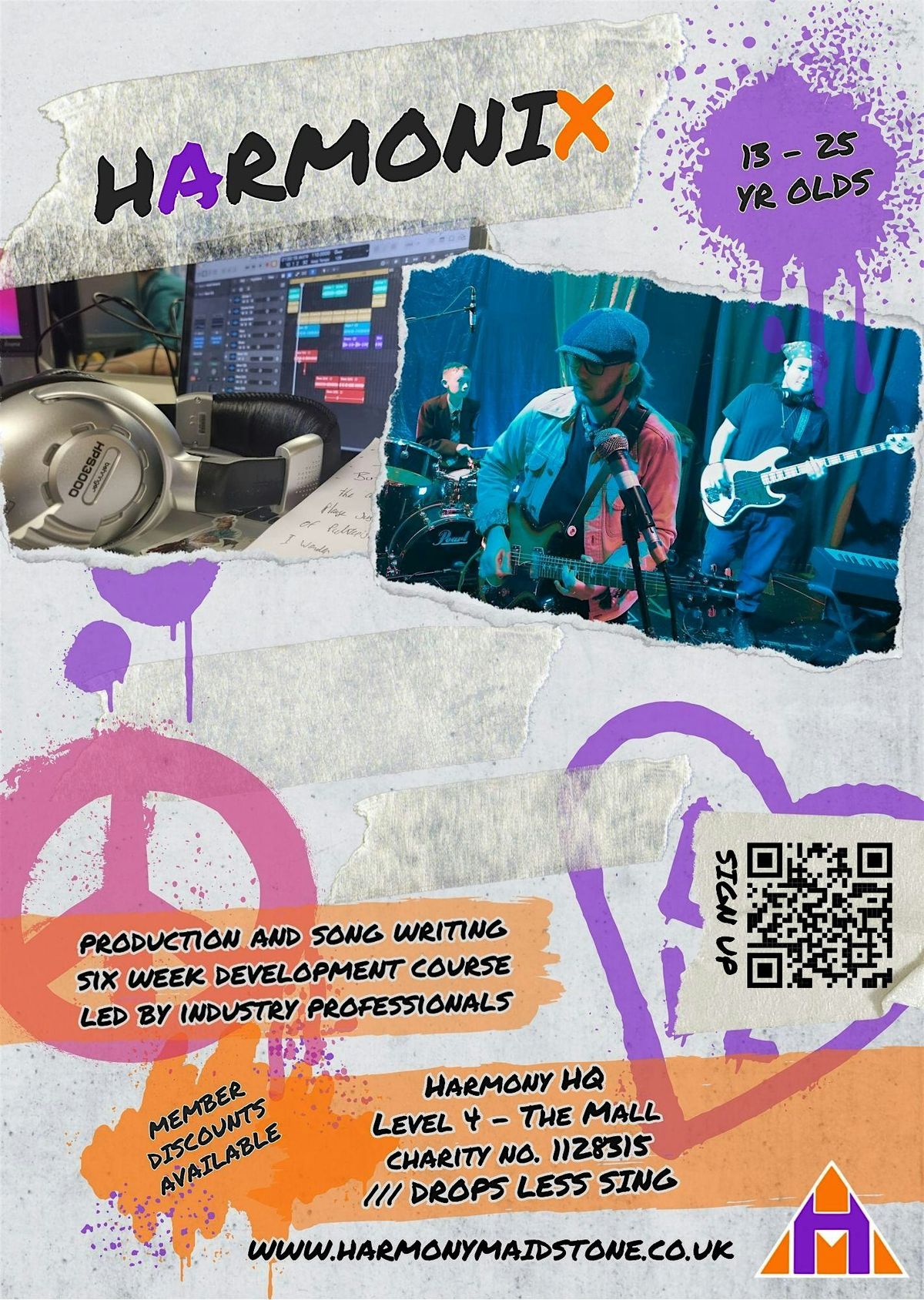 Harmonix Saturday Sessions is Harmony Maidstone’s music production project for young people aged 13–25. Led by industry professionals, these weekly sessions offer a safe, creative space to learn songwriting, music production, mixing, and mastering.