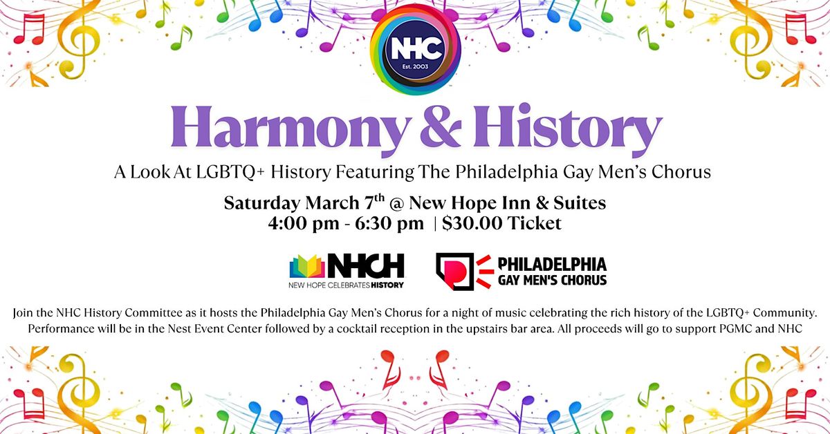 Join New Hope Celebrates History Committee as it hosts the Philadelphia Gay Men's Chorus (PGMC) for a night of music celebrating: "Harmony & History - A Look at LGBTQ+ History". Performance will be at 4pm in the downstairs event area at New Hope Inn & Suites followed by a cocktail reception in the upstairs bar area. All proceeds will go to support PGMC and NHC.