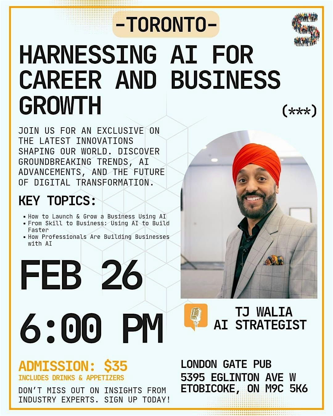 Join The Sifarish Network for an exclusive in-person event on how Artificial Intelligence is transforming careers and businesses. Whether you’re a professional, entrepreneur, or aspiring founder, this session will give you practical insights into how to leverage AI to grow faster, smarter, and more strategically.What you’ll learn:•How to launch and grow a business using AI•Turning your skills into scalable business opportunities with AI•Real-world examples of how professionals are building and scaling with AISpeaker:TJ Walia – AI StrategistTJ will share actionable frameworks, tools, and strategies you can apply immediately to accelerate your career or business journey.