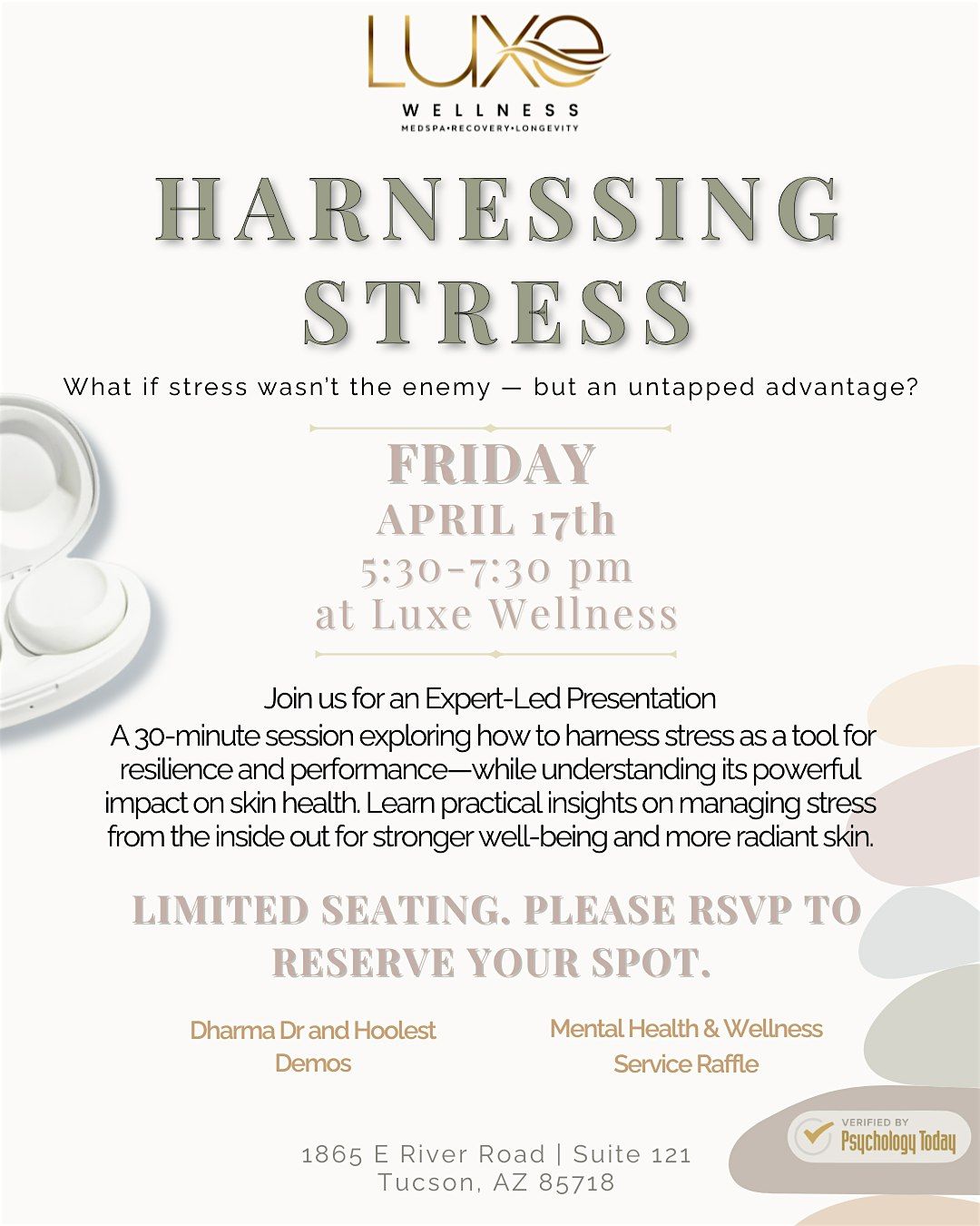 Join us at Luxe Wellness for an evening focused on understanding stress in a new way. This event begins with a 30-minute expert-led presentation exploring how stress can be harnessed as a tool for resilience, focus, and overall well-being, while also discussing the impact stress can have on skin health.