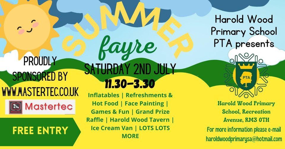 Harold Wood Primary School PTA returns with a bang to bring you our first annual Summer Fayre since 2019.Raising money for The Harold Wood Primary School Parent Teacher Association (Registered charity number 278629)