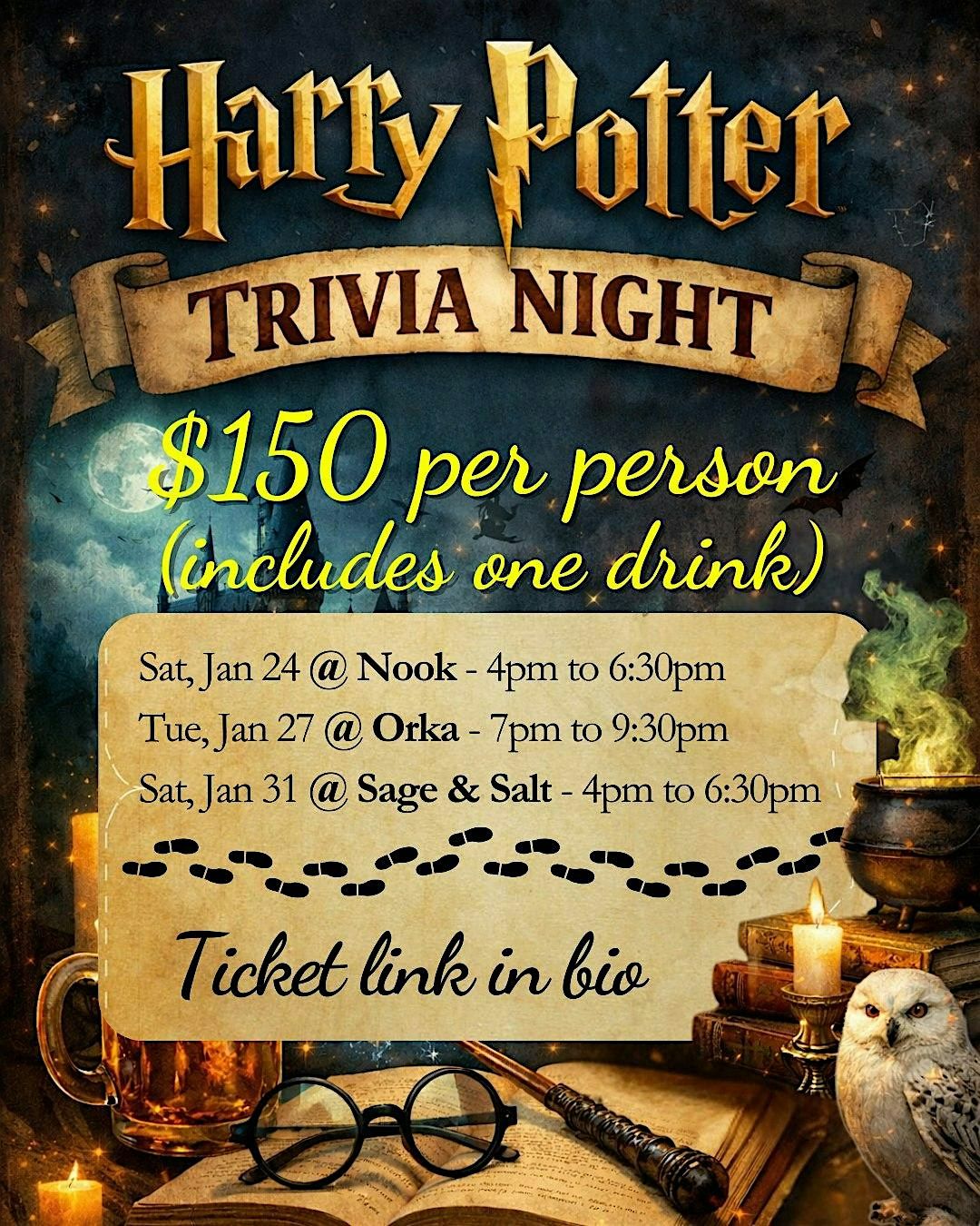 This night is for everyone! Doesn’t matter if you’ve read the movies, watched the books, or vice versa - join us for an inclusive, fun, and magical trivia night celebrating all things Harry Potter 🧙♀️✨