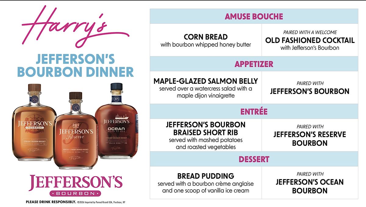 Join us for an intimate evening celebrating the depth, character, and versatility of Jefferson’s Bourbon through a thoughtfully curated, multi-course dining experience at Harry's at Hofheimer.