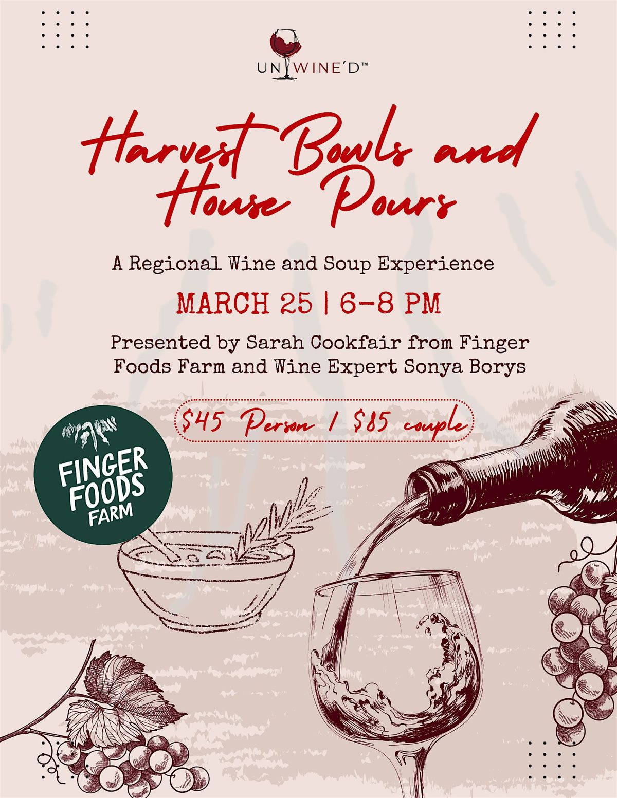 Warm up with a cozy, regional tasting experience that brings together handcrafted soups and thoughtfully paired wines. Join Finger Foods Farm’s Sarah Cookfair and wine expert Sonya Borys for an intimate evening celebrating seasonal ingredients, local makers, and the art of pairing.