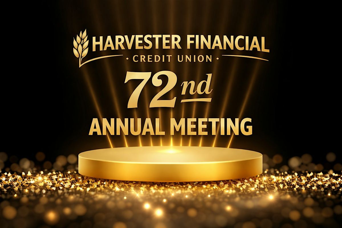 Join us in person for the Harvester Financial Credit Union's 72nd Annual Meeting! It’s a great chance to connect, hear updates, and celebrate another fantastic year together. Don’t miss out on the fun and important info—we can’t wait to see you there!