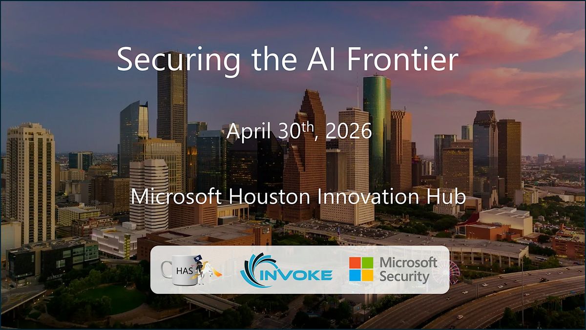 We are pleased to invite you to: Securing the AI Frontier. A full-day, invitation-only, in-person learning event on April 30th, 2026, at the Microsoft Innovation Hub in Houston. Hosted by Invoke, Microsoft and the Houston Area Security & Management User Group (HASMUG), this event is designed for cybersecurity community members and leaders navigating the realities of Microsoft Agentic AI and Security Copilot, governing agents, closing exposure gaps, and building enterprise AI trust at scale.
