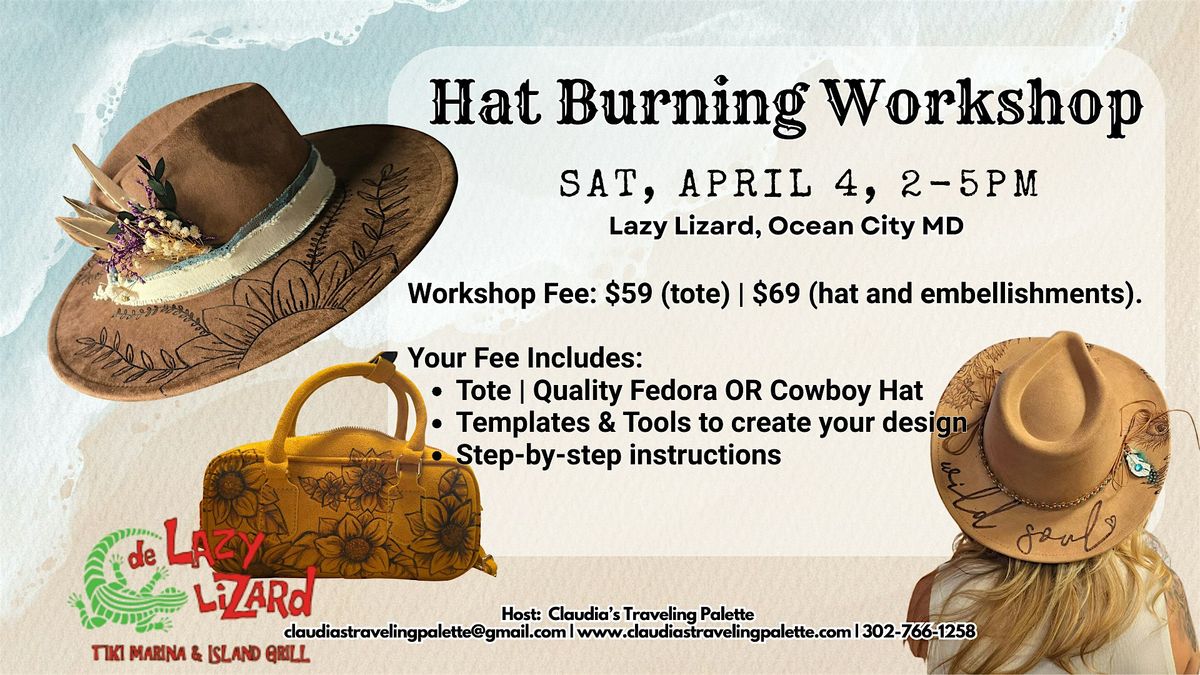 Join us for a creative night out at de LAZY LIZARD, Ocean City MD, and design your very own custom flat brim fedora, cowboy hat, or tote bag! You’ll use wood-burning tools, and embelishments to create a hat/tote that’s truly one-of-a-kind.