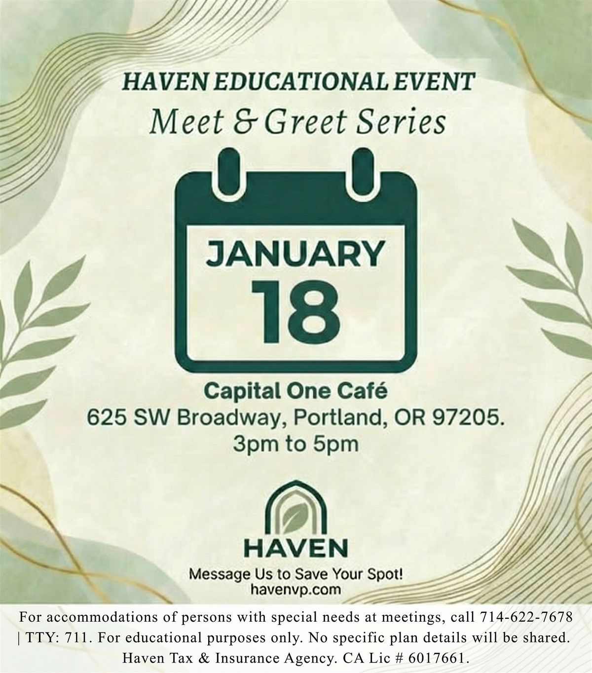 Our Meet & Greet series is stopping in Portland! Come say hello to the Haven Tax & Insurance team on Jan 18th at the Capital One Café downtown.