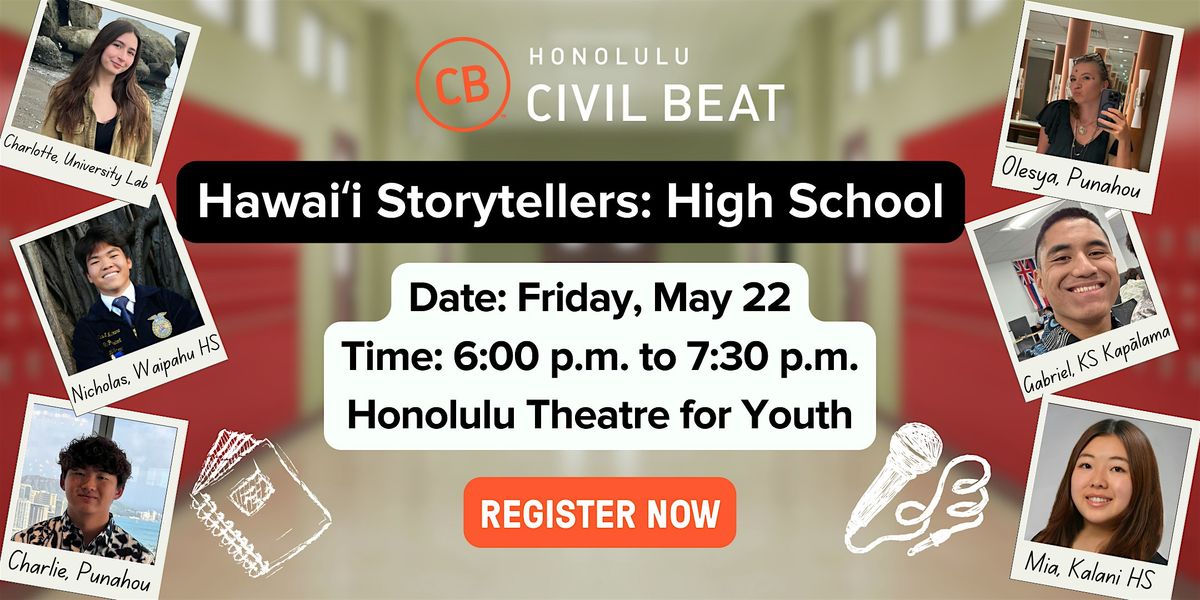 Join us for Civil Beat's storytelling event featuring a group of Hawaiʻi high school students from 6 to 7:30 p.m. on Friday, May 22 at Honolulu Theatre for Youth, also known as Tenney Theatre on the grounds of The Cathedral of St. Andrew. These young voices will take the stage to share personal stories of growth, resilience and their hopes for the future of Hawaiʻi.