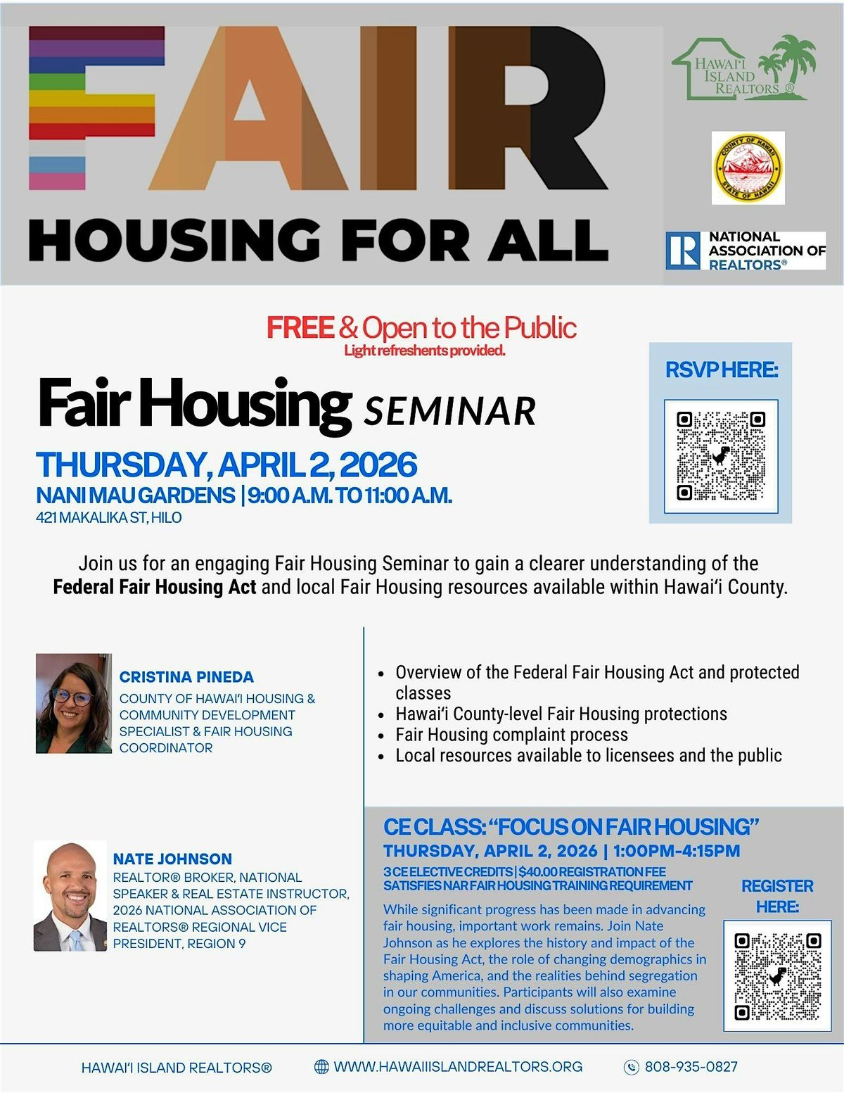 Join us for an engaging Fair Housing Seminar to gain a clearer understanding of the Federal Fair Housing Act and local Fair Housing resources available within Hawaiʻi County. FREE & Open to the Public. Light morning refreshments provided. Who should attend? Landlords, Tenants, Real Estate Licensees and Property Managers, and Housing Sector Organizations.