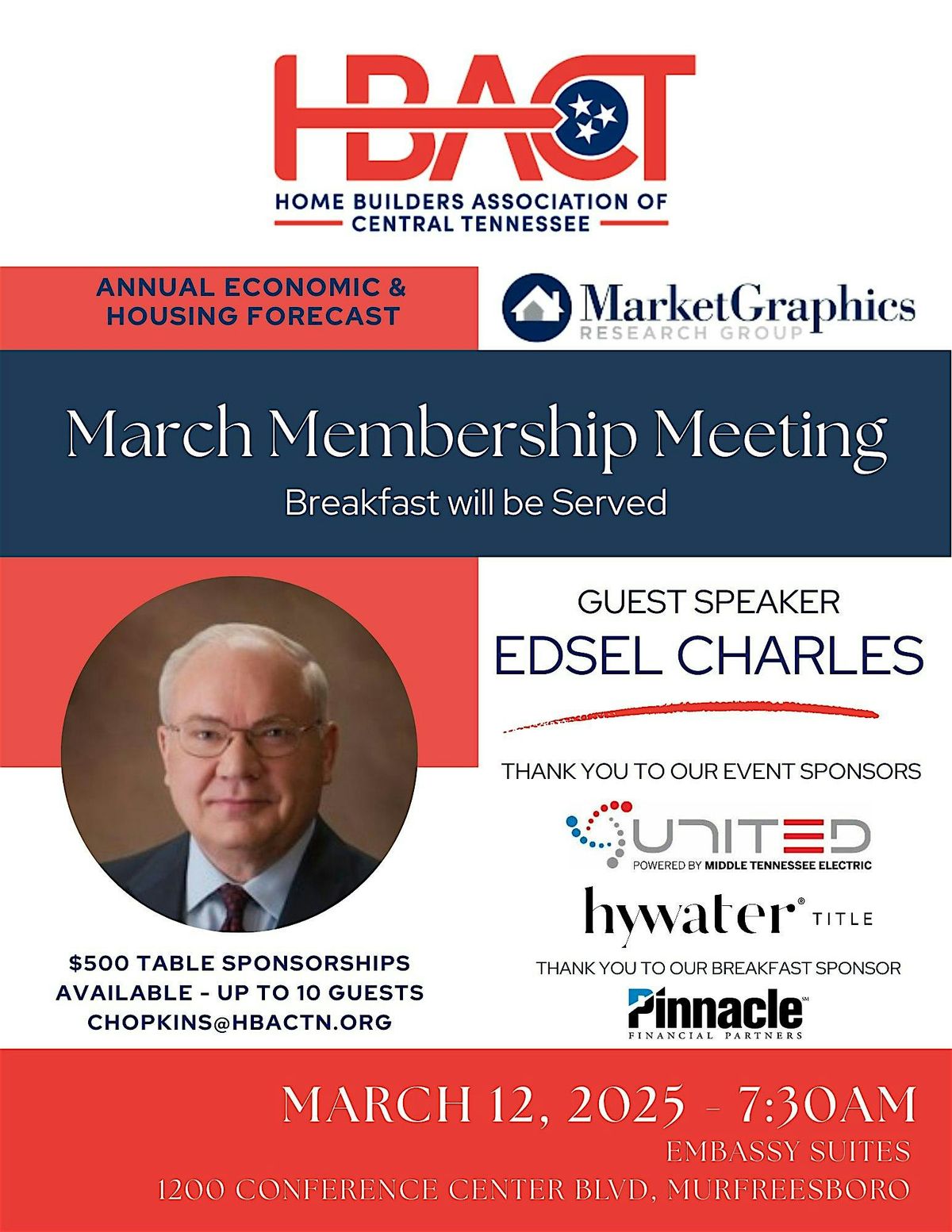 Members, please join us for our annual informative breakfast meeting with the one and only, Edsel Charles with Market Graphic Research Group. Edsel brings an in-depth, unique, accurate dive into the housing market trends and future outlook on the home building industry.