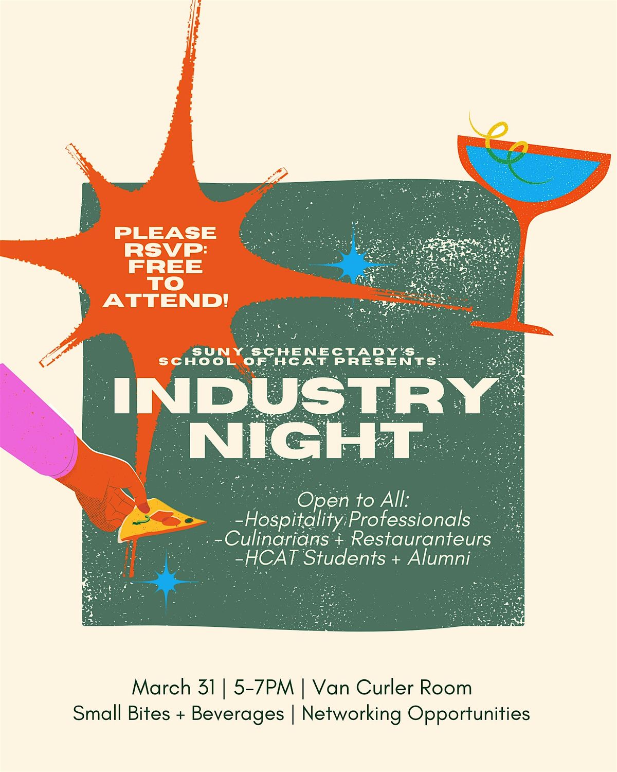 Join us for HCAT Industry Night, an annual networking event hosted by the SUNY Schenectady School of Hotel, Culinary Arts and Tourism (HCAT). This evening brings together hospitality and foodservice professionals, alumni, students, faculty, and community partners for a relaxed, welcoming night of connection.