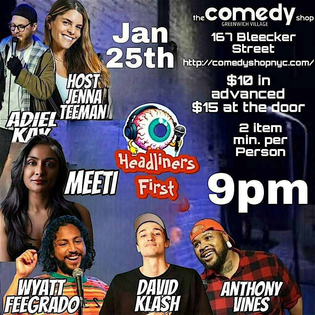 New York City Comedians including Adiel Kay, Anthony Vines, Jenna Teeman, David Klash, Wyatt Feegrado and MeetI will be at The Comedy Shop 167 Bleecker St. NY, NY putting on the best comedy show in the West Village called the HEADLINERS FIRST COMEDY SHOW! 2 item minimum. Tickets are $15 at the door.