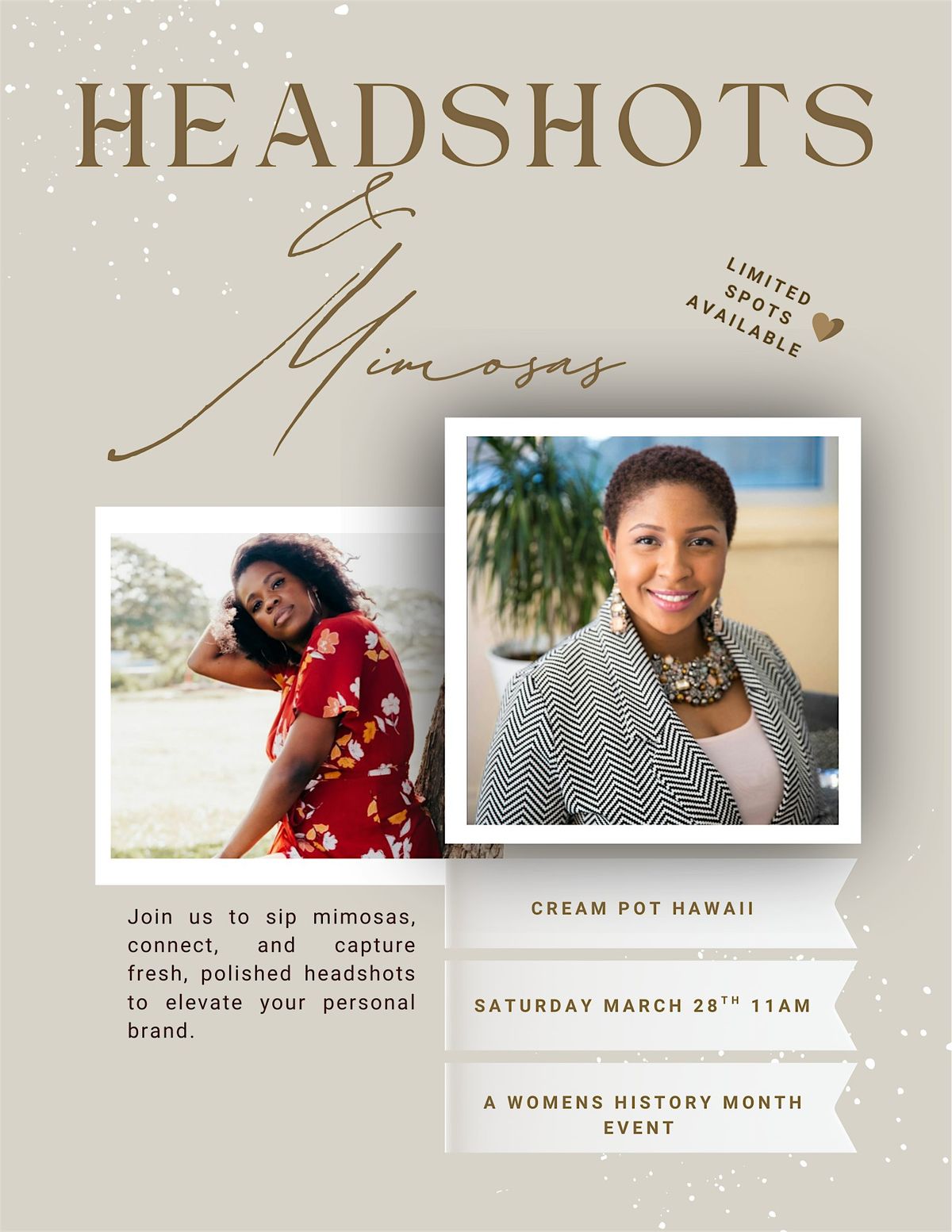 Join the Hawai'i Black Chamber of Commerce and DK Visuals Hawai'i for Headshots & Mimosas, a special event honoring Women’s History Month! This empowering gathering is designed to celebrate women in business and leadership with professional headshots, networking, and, of course, refreshing mimosas. Elevate your brand with a polished new look while connecting with fellow trailblazers in the community. It's the perfect way to update your professional image and have a great time doing it. Don't miss out on this unique opportunity to network, socialize, and enjoy a relaxing atmosphere. See you there!