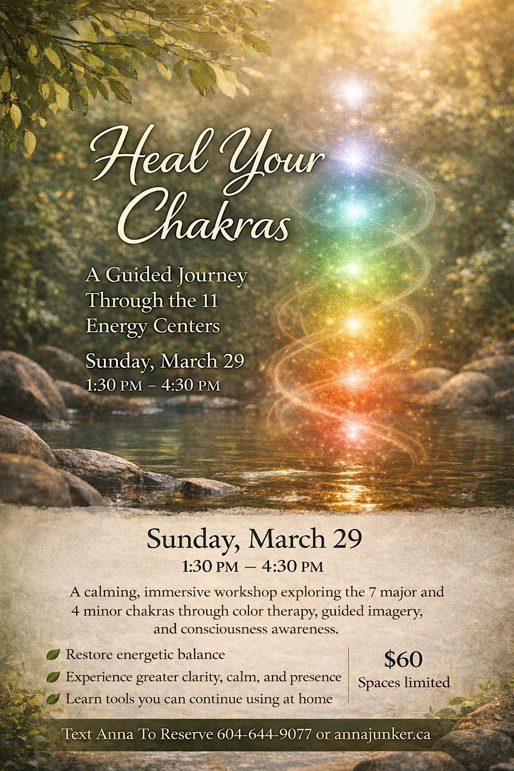 Join us for a calming, immersive 3-hour in-person workshop exploring the 7 major chakras and 4 minor chakras through color therapy, guided imagery, and conscious awareness.