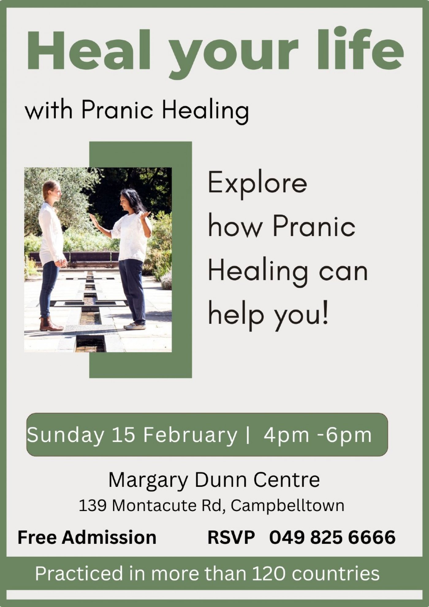 Join us for a transformative session designed to introduce you to the powerful science of Pranic Healing , an internationally practised no-touch , no drug energy healing. In this interactive experience, you'll learn the basics of energy healing and how prana (life force) affects your physical emotional and mental well-being. Learn to feel Prana in your hands. We will do some fun experiments with prana!