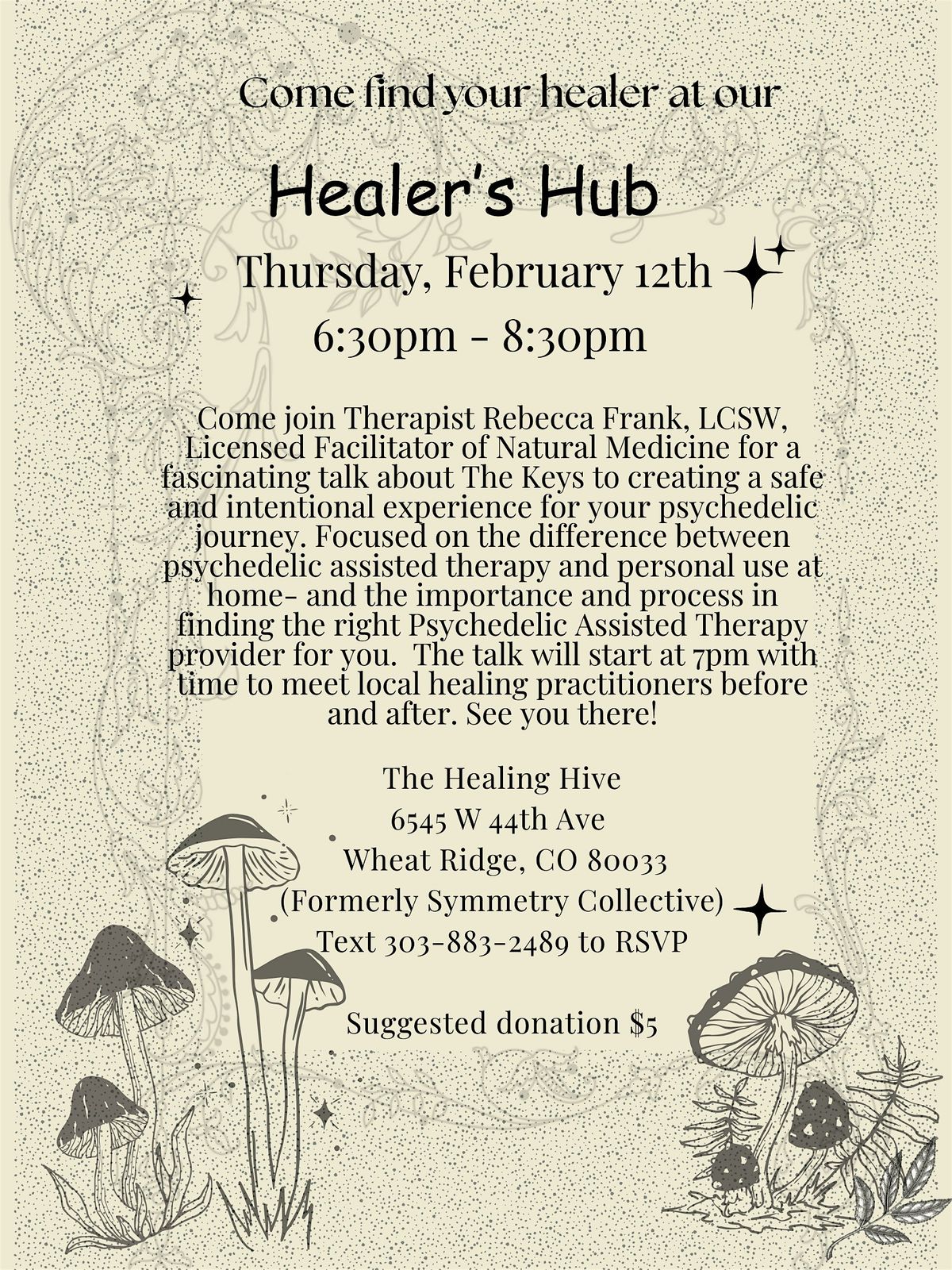 Come join Therapist Rebecca Frank, LCSW, Licensed Facilitator of Natural Medicine for a fascinating talk about The Keys to creating a safe and intentional experience for your psychedelic journey. Focused on the difference between psychedelic assisted therapy and personal use at home- and the importance and process in finding the right Psychedelic Assisted Therapy provider for you. The talk will start at 7pm with time to meet local healing practitioners before and after. See you there!
