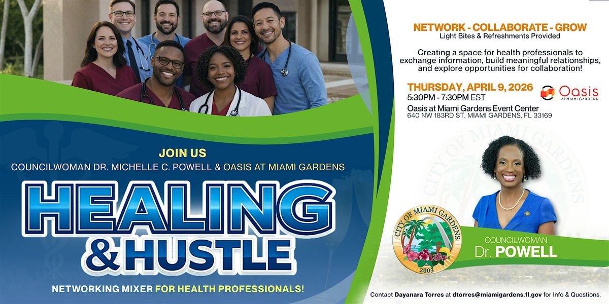 Join us for Healing & Hustle: A Networking Mixer for Health Professionals, an evening designed to bring together the medical and wellness community in Miami Gardens and beyond for meaningful connection and collaboration.
