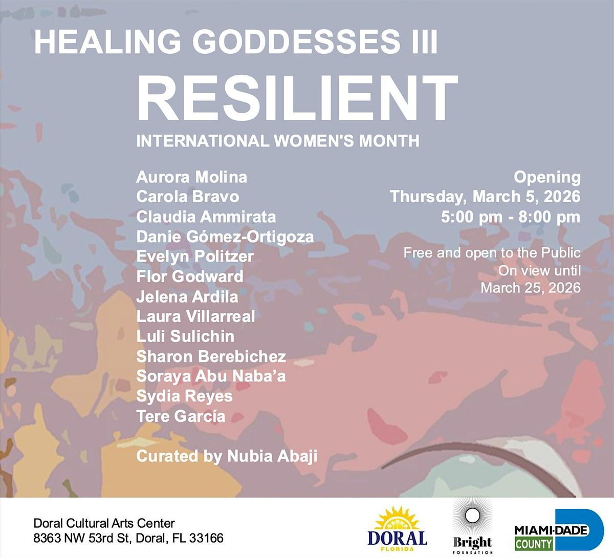 You are invited to the International Women’s Month celebration cocktail reception, featuring the opening of the art exhibition “Healing Goddesses III: Resilient,” which exalts the work of 13 remarkable women artists, meticulously selected to celebrate the extraordinary strength of women—their resilience—across the many dimensions of their lives and as the support and backbone of society.