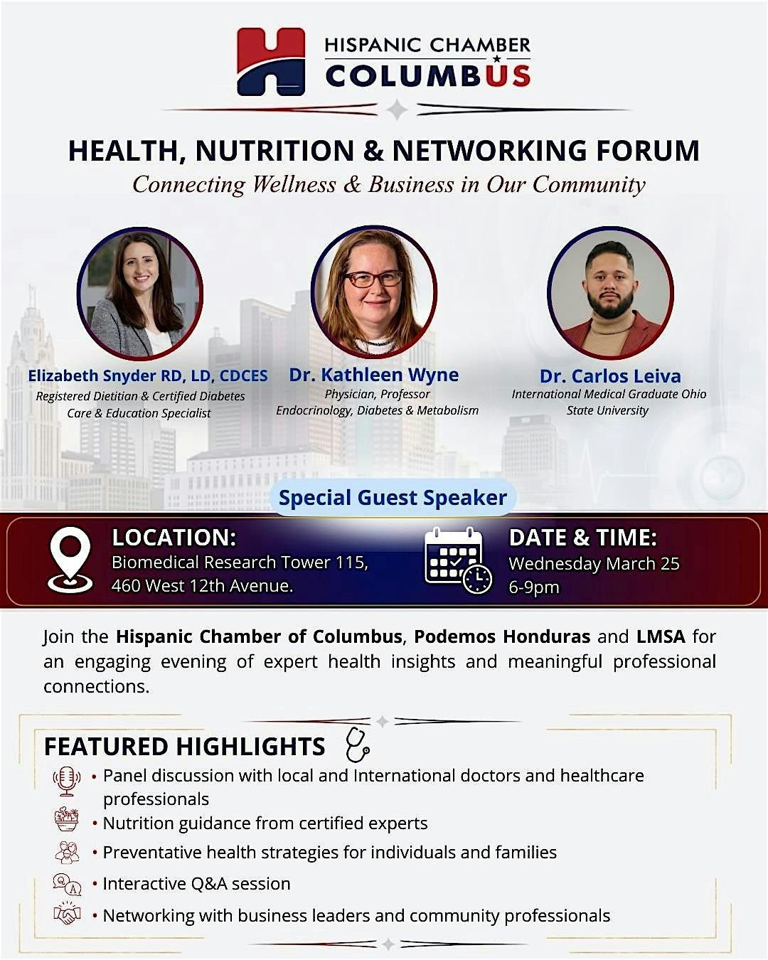 Join the Hispanic Chamber of Columbus, in partnership with Podemos Honduras and LMSA, for an engaging evening focused on health, wellness, and professional connection.
