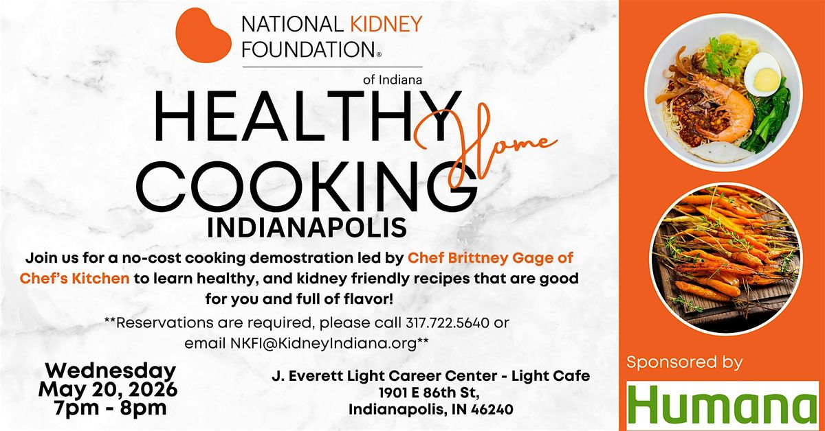 Info: Join us on Wednesday, March 28 2026, from 7PM – 8PM for the National Kidney Foundation of Indiana's "Healthy Home Cooking" demonstration at the J. Everett Light Career Center in Indianapolis. This month’s demonstration will be led by Chef Brittney Gage of Chef’s Kitchen and she will be demonstrating that you do not have to sacrifice flavor to eat healthy! As an added bonus, all attendees will get to sample the dish that is prepared.