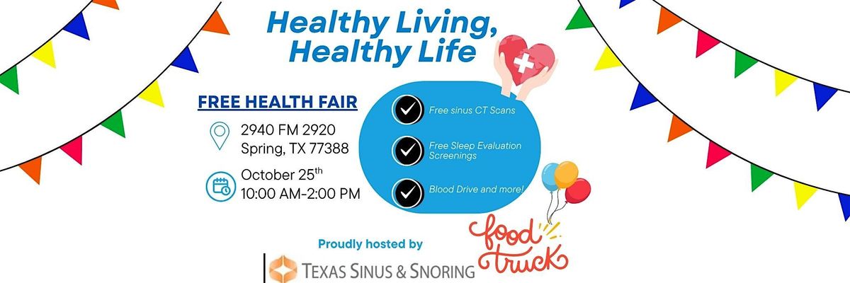 Texas Sinus & Snoring is excited to host the second annual Healthy Living, Healthy Life free health fair for the Spring, Klein and Houston areas. It's time to take control of our health as a community. This health fair will showcase several of our area's finest practitioners, on top of that they'll be offering free services. Free services include: Sinus CT scans, Blood drive, Blood pressure screenings, and many more!