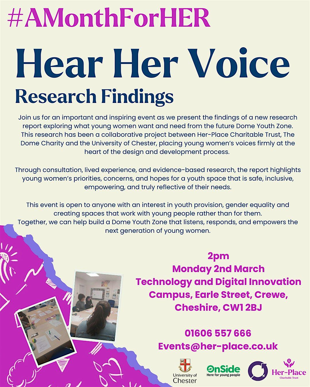 This research has been a collaborative project between Her-Place Charitable Trust, The Dome Charity, and the University of Chester, placing young women’s voices firmly at the heart of the design and development process. Through consultation, lived experience, and evidence-based research, the report highlights young women’s priorities, concerns, and hopes for a youth space that is safe, inclusive, empowering, and truly reflective of their needs.