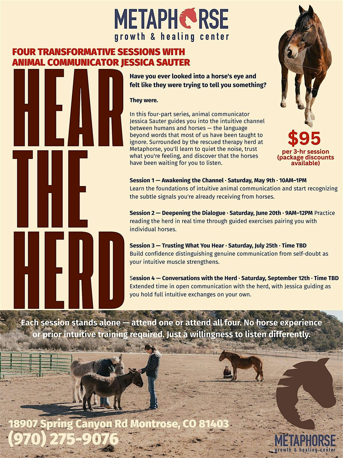 In this four-part series, animal communicator Jessica Sauter guides you into the intuitive channel between humans and horses — the language beyond words that most of us have been taught to ignore. Surrounded by the rescued therapy herd at Metaphorse, you'll learn to quiet the noise, trust what you're feeling, and discover that the horses have been waiting for you to listen.