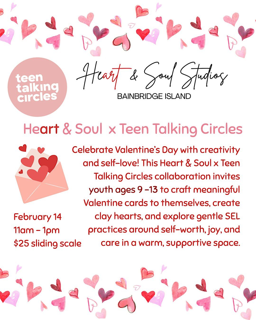 Join us for a Valentine’s Day celebration focused on self-love, creativity, and joy! On February 14 from 11am – 1pm, Teen Talking Circles is partnering with Heart & Soul to host a special crafting and connection event for youth ages 9 – 13.