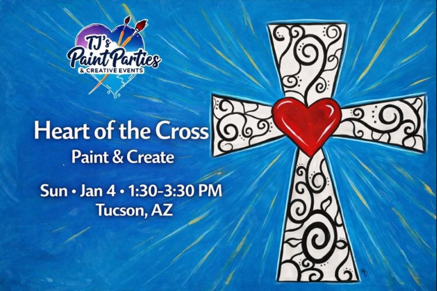Paint a meaningful Heart of the Cross design that blends faith, reflection, and creativity. This guided, step-by-step paint class is beginner-friendly and offers a peaceful, uplifting space to create. Whether you’re painting as an expression of faith, meditation, or simply curiosity, you’ll be encouraged to add your own personal touches and leave with a finished piece you’ll be proud to display.