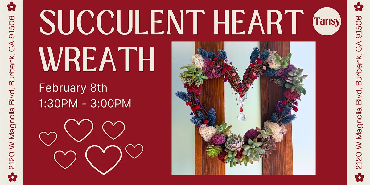 Celebrate Valentines at Tansy with our Heart Succulent Wreath Workshop! Join us as we craft valentines-inspired floral wreaths using all-natural grapevine frames. Learn to adorn your wreath with succulents, dried flowers, moss, and sun catching crystals.