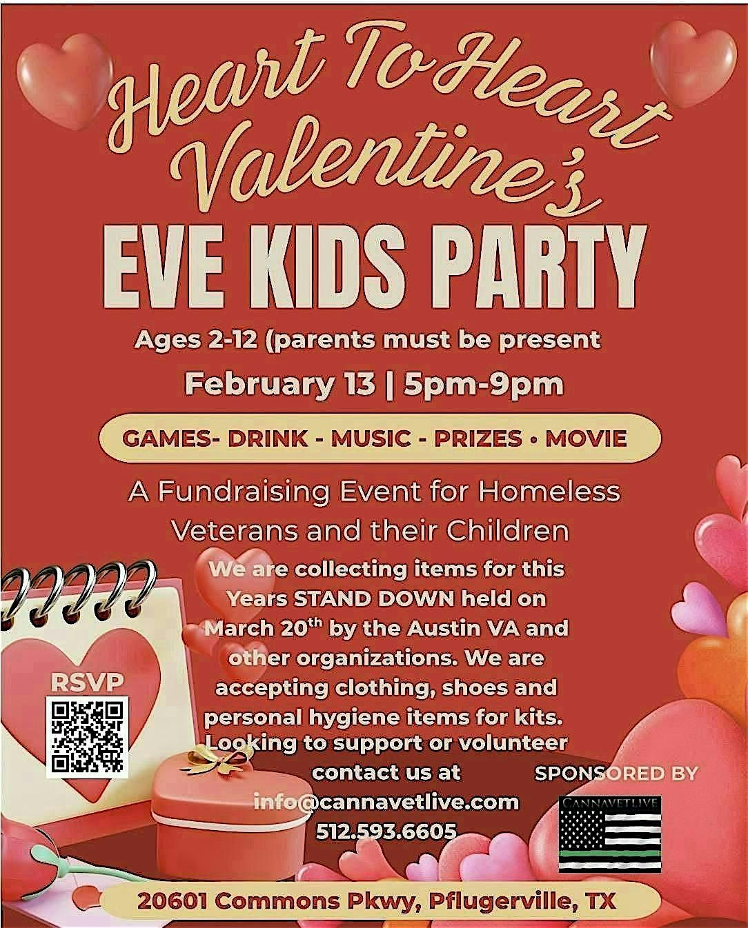 We’re hosting a special Valentine’s event for kids (ages 2–12) to benefit Cannavetlive and homeless veterans.