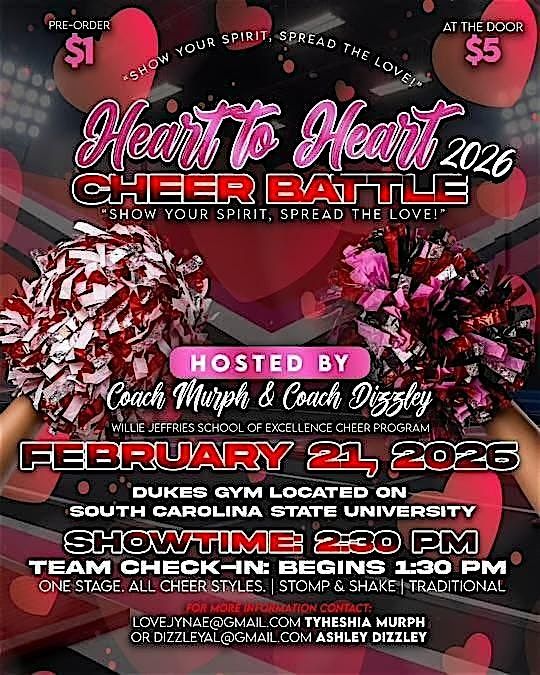 Welcome to the Heart to Heart Cheer Battle happening at Dukes Gymnasium (on the campus of SC State University) on Saturday, February 21, 2026 at 2:30 PM (Eastern Time)!