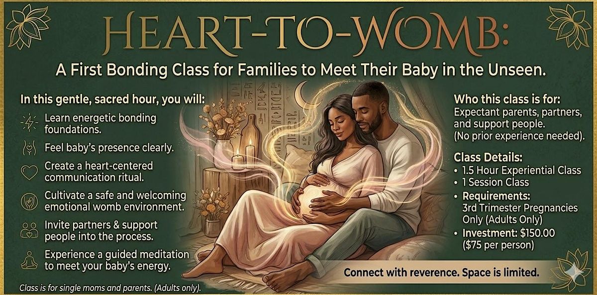 Heart‑to‑Womb is a gentle, sacred hour designed to help expectant families connect with their unborn child through energetic presence, intuitive listening, and somatic attunement. Before the first breath, before the first cry, there is already a relationship forming—one made of sensation, intention, and the quiet language of the soul. This class invites you to step into that early bond with reverence.