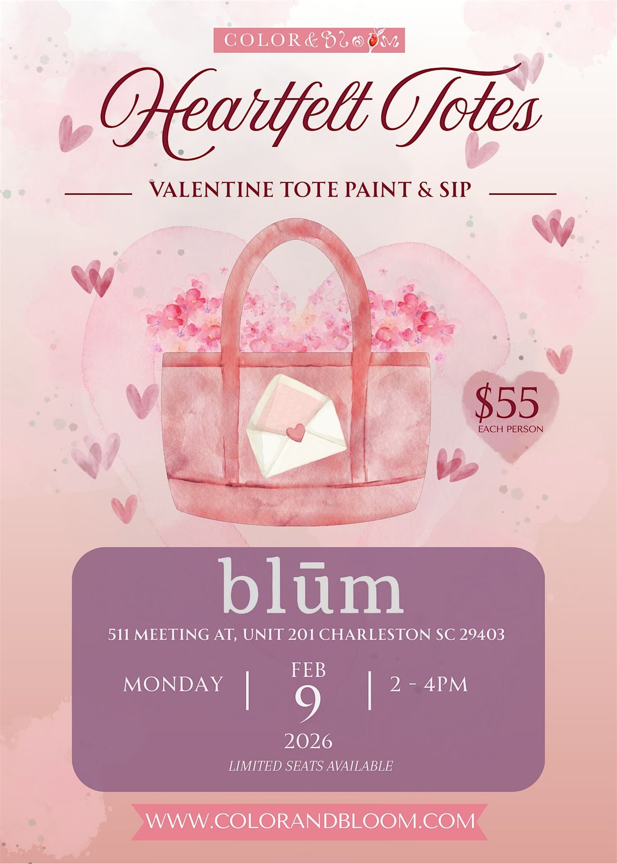 Join Color & Bloom for a cozy and creative paint & sip experience where you’ll design your own hand-painted canvas tote bag—perfect for Valentine’s, Galentine’s, or a sweet self-care night out.