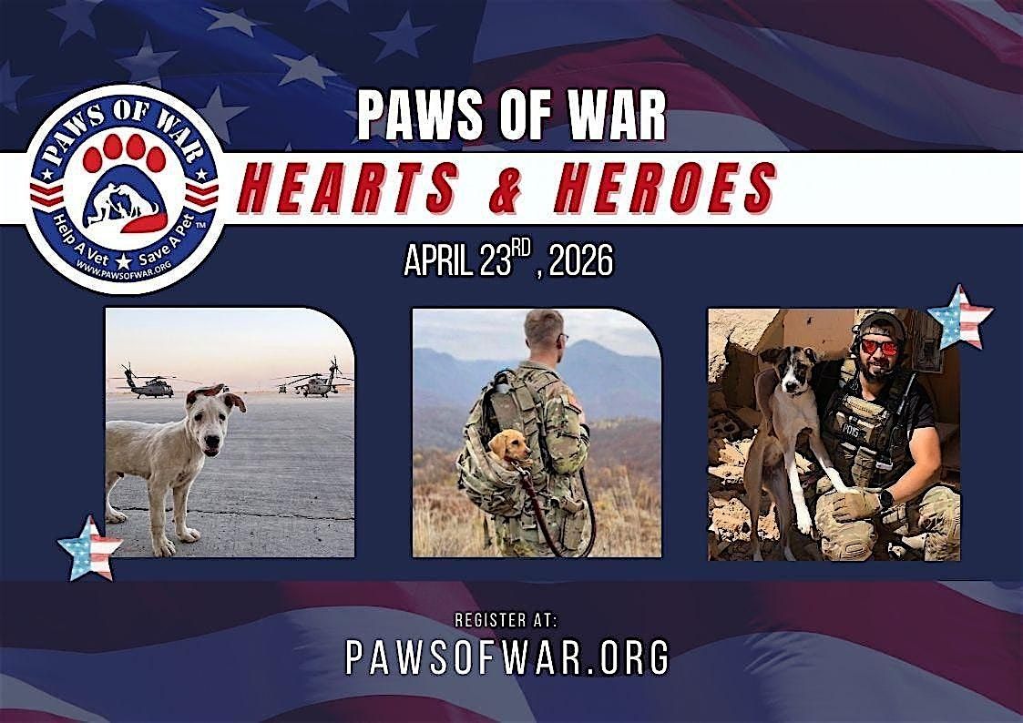 Join us for an unforgettable evening celebrating courage, compassion, and the unbreakable bond between our nation’s heroes and the animals who stand beside them. Hearts and Heroes honors the lifesaving work of Paws of War, whose mission is to support veterans, first responders, and their families through service dogs, emotional support animals, and life-changing programs that restore hope, healing, and independence.
