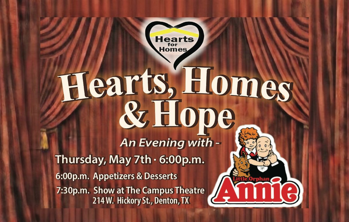 Join Hearts for Homes for their 20th Anniversary Celebration, a collaboration between Theatre Denton, Superior Floors and Hearts for Homes. This May 7 fundraiser will be a fun evening with appetizers and desserts served at 6:00 p.m., followed by the 7:30 p.m. performance of Annie. Check out the sponsorship opportunities below. Hope to see you on May 7.