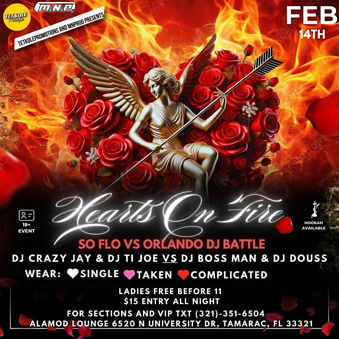 Welcome to Hearts On Fire: Orlando Vs Miami Dj Competition! Get ready for an epic showdown at ALAMOD HOOKAH LOUNGE on February 14, 2026. It's going to be a night to remember as top DJs battle it out for the crown. Don't miss out on the electrifying beats and intense competition. Grab your friends and join us for a night of music, fun, and excitement!