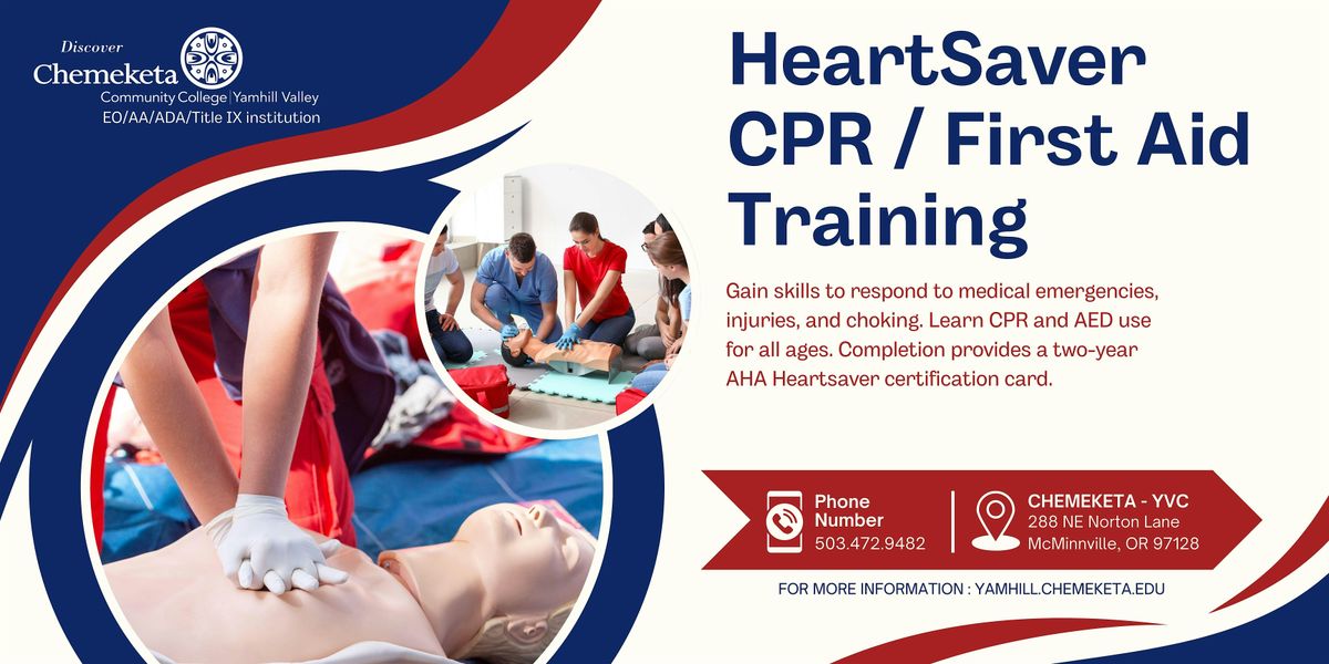 Gain skills to respond to medical emergencies, injuries, and choking. Learn CPR and AED use for all ages. Completion provides a two-year AHA Heartsaver certification card.