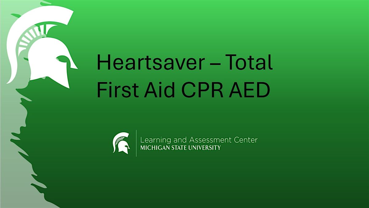The Heartsaver Total - First Aid CPR AED Online course is intended for individuals with little or no medical background who are required to complete training for their job or other regulatory requirements. The course is also intended for individuals who wish to be prepared for an emergency in any setting. The blended learning course consists of an online learning component in addition to a hands-on skills portion.
