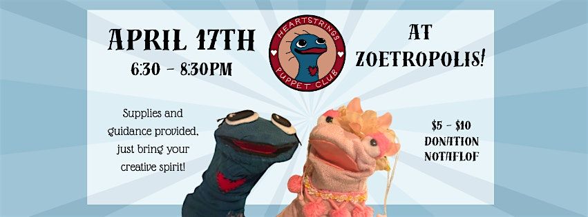 Join us in creative community for another Heartstrings Puppet Club! No experience is needed and all supplies are provided.